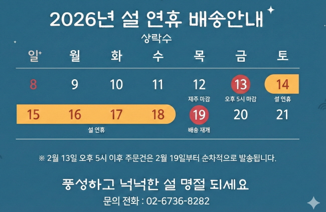 아래와 같이 상락수 차가버섯 설 연휴 택배 발송 일정을 안내 드립니다.